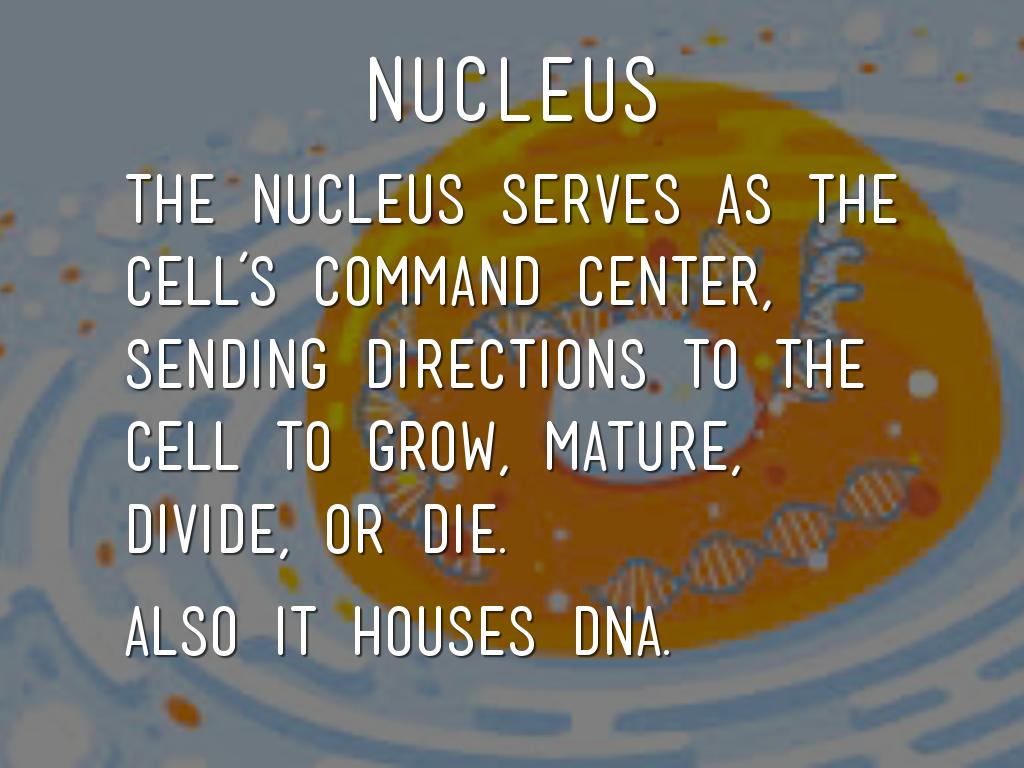 The nucleus serves as the cell’s command center, sending directions to the cell to grow, mature, divide, or die.