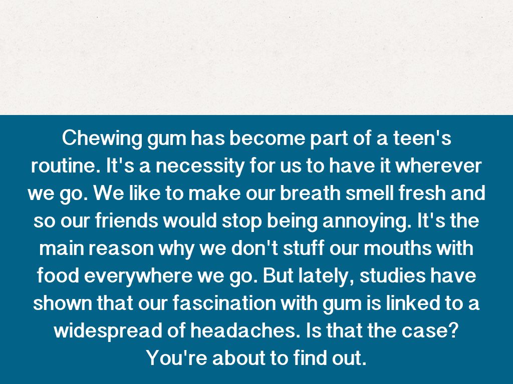 Chewing gum has become part of a teen's routine. It's a necessity for us to have it wherever we go. We like to make our breath smell fresh and so our friends would stop being annoying. It's the main reason why we don't stuff our mouths with food everywhere we go. But lately, studies have shown that our fascination with gum is linked to a widespread of headaches. Is that the case? You're about to find out.