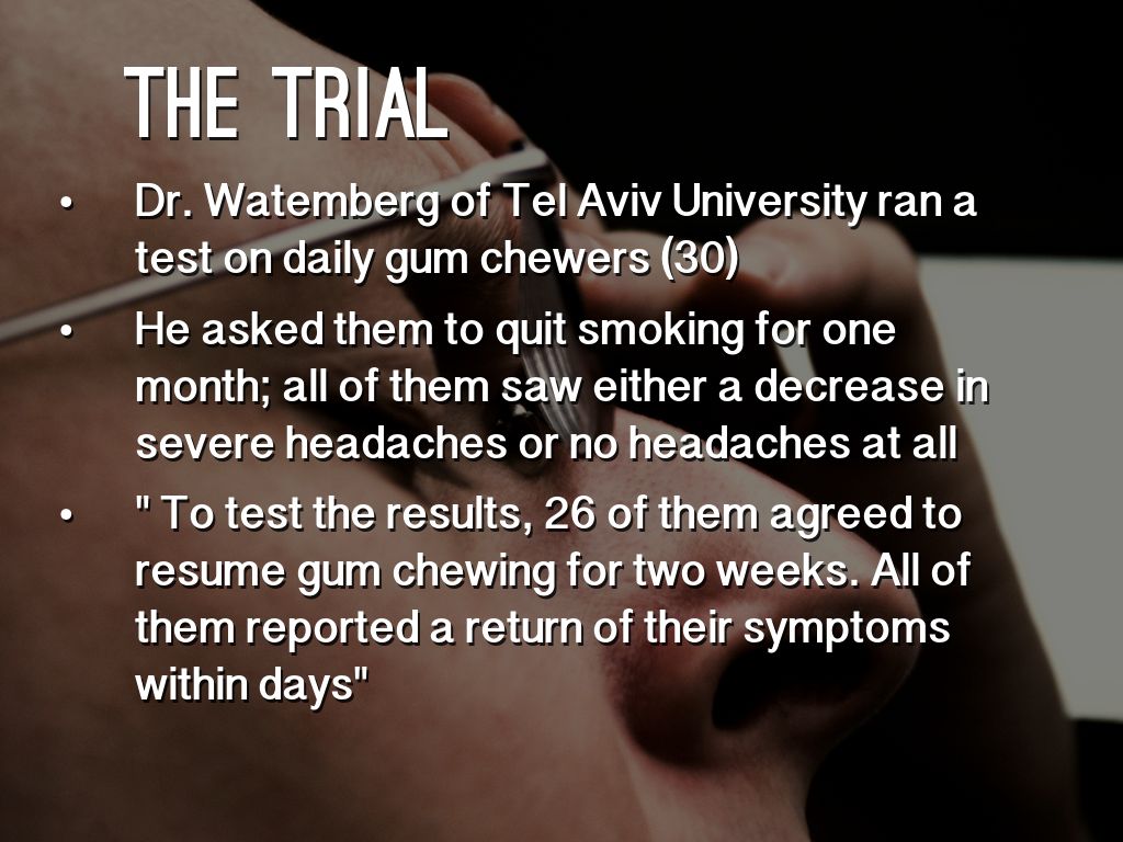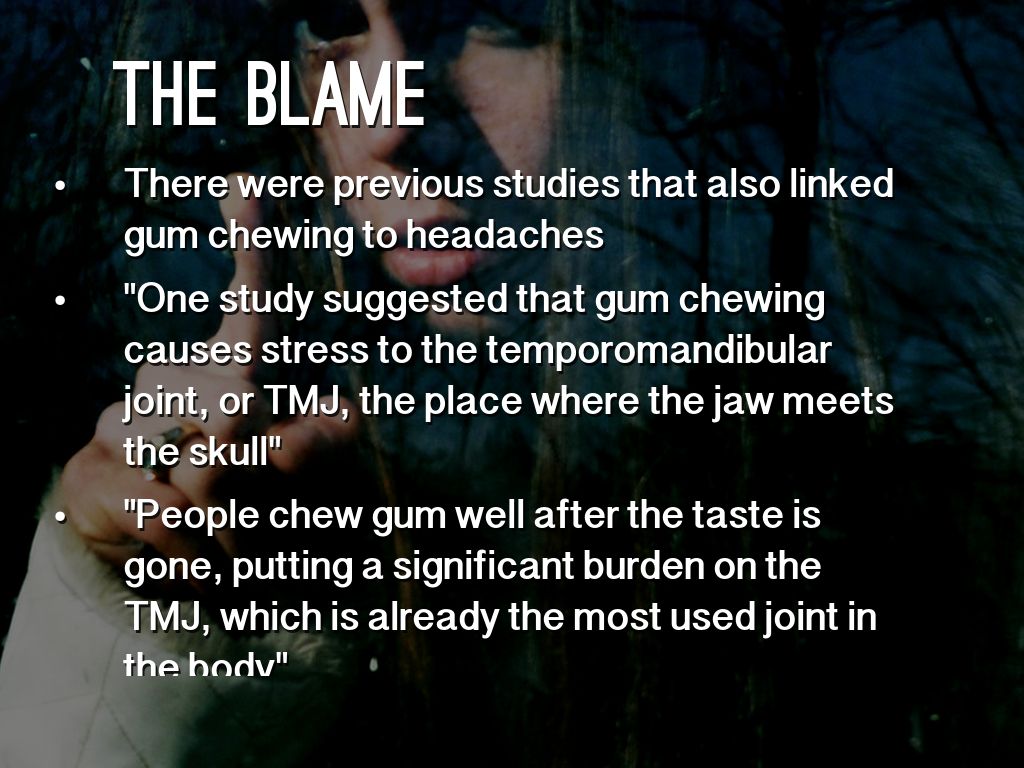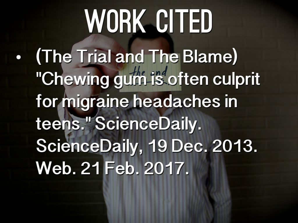• (The Trial and The Blame) "Chewing gum is often culprit for migraine headaches in teens." ScienceDaily. ScienceDaily, 19 Dec. 2013. Web. 21 Feb. 2017.