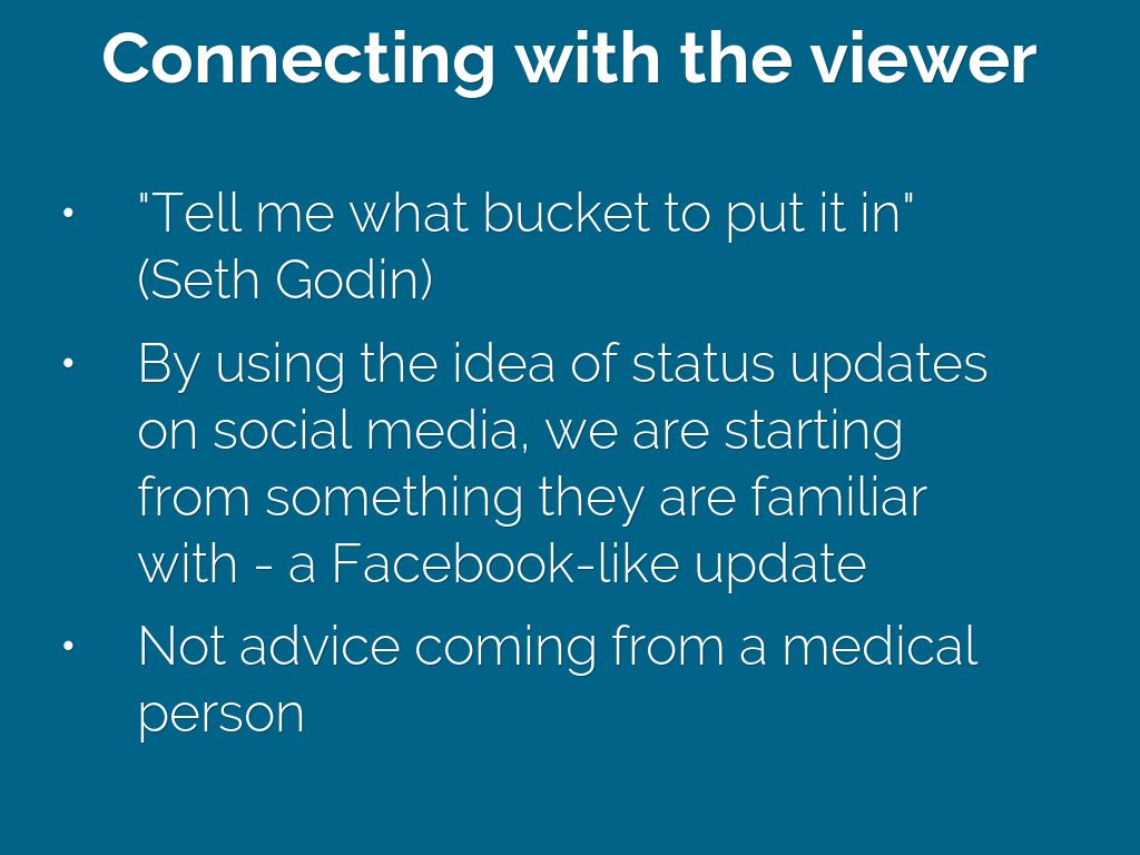 - By using the idea of status updates on social media, we are starting from something they are familiar with - a Facebook-like update