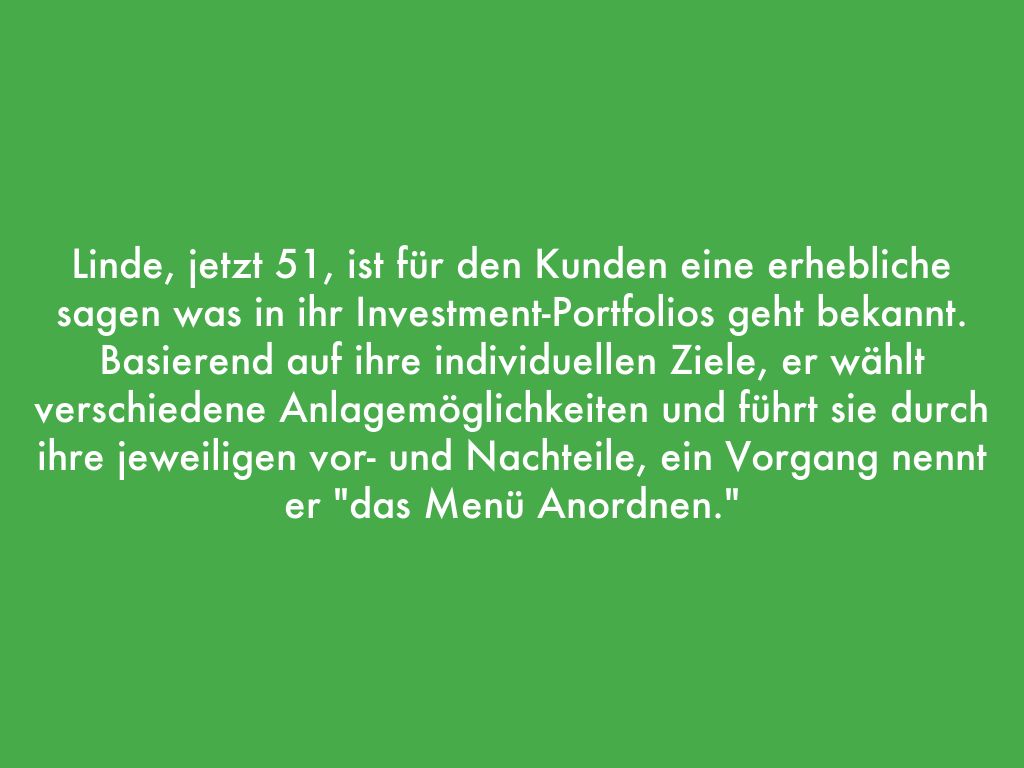 Linde, jetzt 51, ist für den Kunden eine erhebliche sagen was in ihr Investment-Portfolios geht bekannt. Basierend auf ihre individuellen Ziele, er wählt verschiedene Anlagemöglichkeiten und führt sie durch ihre jeweiligen vor- und Nachteile, ein Vorgang nennt er "das Menü Anordnen."