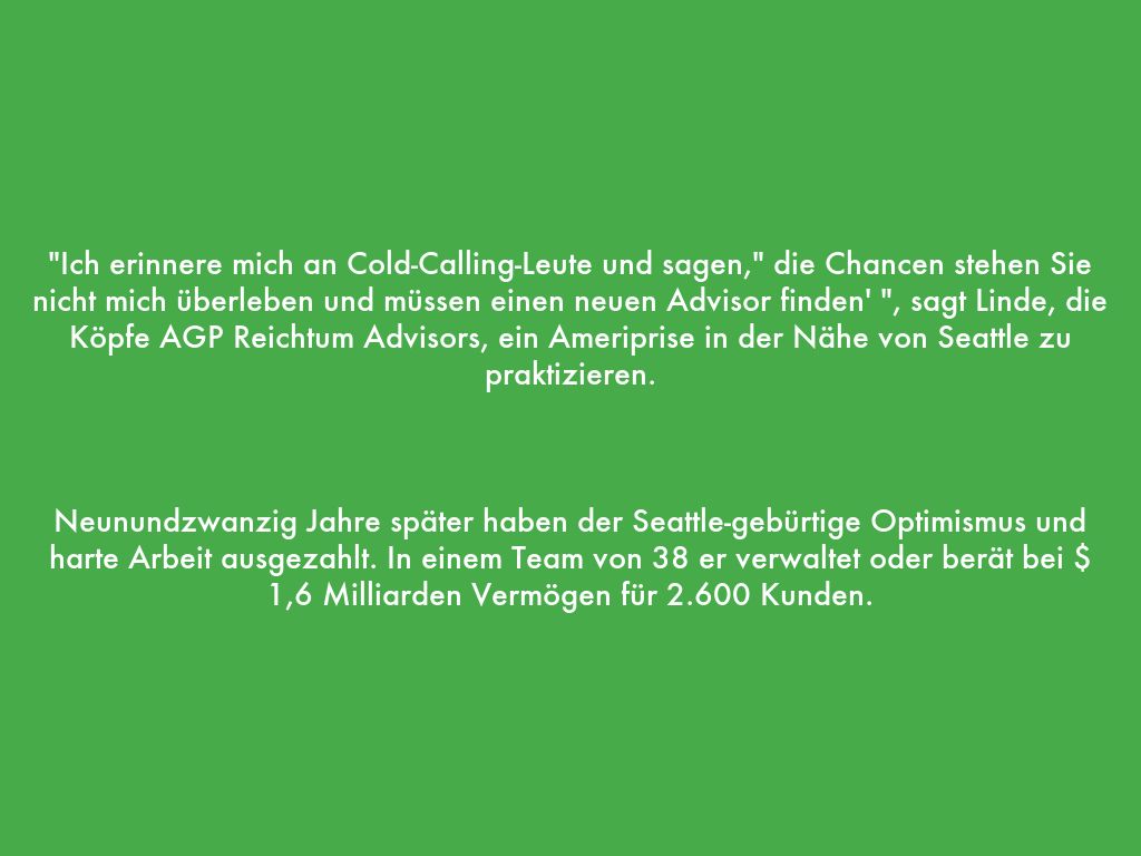 "Ich erinnere mich an Cold-Calling-Leute und sagen," die Chancen stehen Sie nicht mich überleben und müssen einen neuen Advisor finden' ", sagt Linde, die Köpfe AGP Reichtum Advisors, ein Ameriprise in der Nähe von Seattle zu praktizieren.