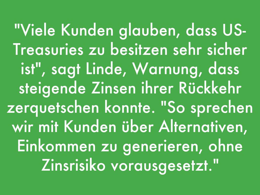 "Viele Kunden glauben, dass US-Treasuries zu besitzen sehr sicher ist", sagt Linde, Warnung, dass steigende Zinsen ihrer Rückkehr zerquetschen konnte. "So sprechen wir mit Kunden über Alternativen, Einkommen zu generieren, ohne Zinsrisiko vorausgesetzt."