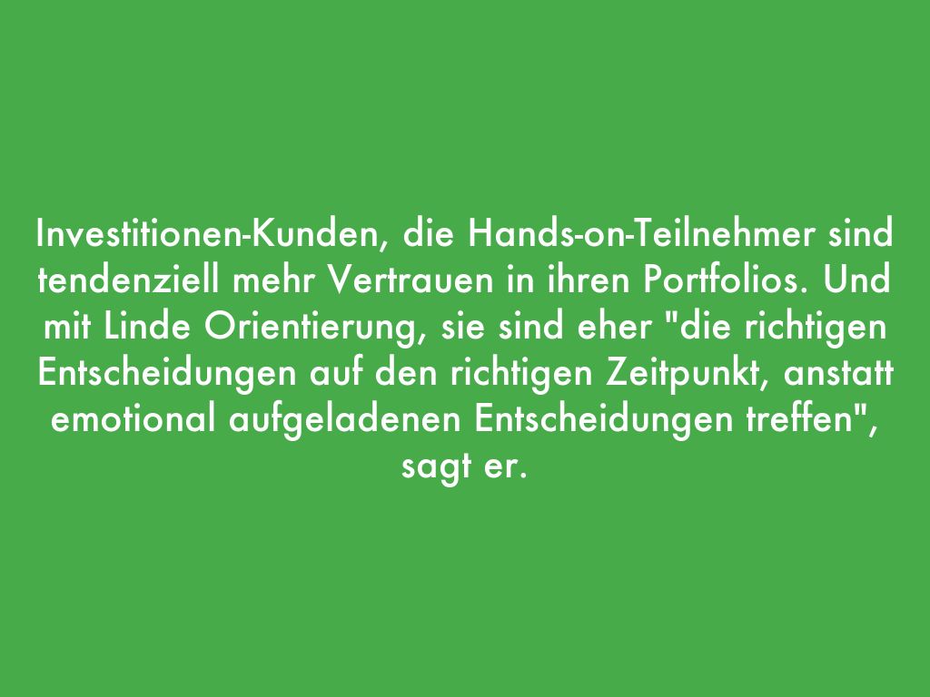 Investitionen-Kunden, die Hands-on-Teilnehmer sind tendenziell mehr Vertrauen in ihren Portfolios. Und mit Linde Orientierung, sie sind eher "die richtigen Entscheidungen auf den richtigen Zeitpunkt, anstatt emotional aufgeladenen Entscheidungen treffen", sagt er.