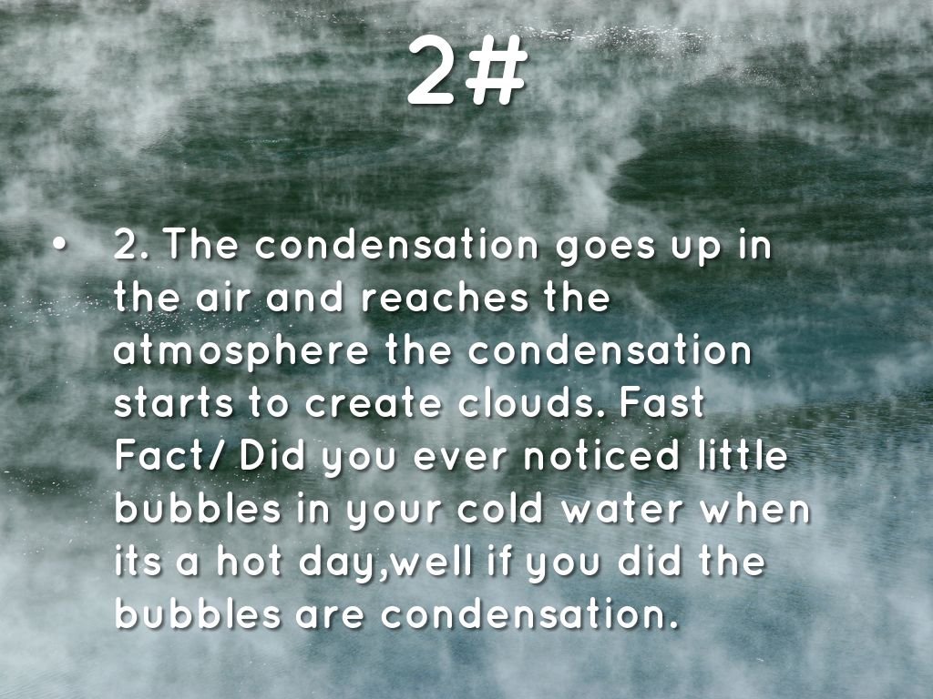 2. The condensation goes up in the air and reaches the atmosphere the condensation starts to create clouds. Fast Fact/ Did you ever noticed little bubbles in your cold water when its a hot day,well if you did the bubbles are condensation.