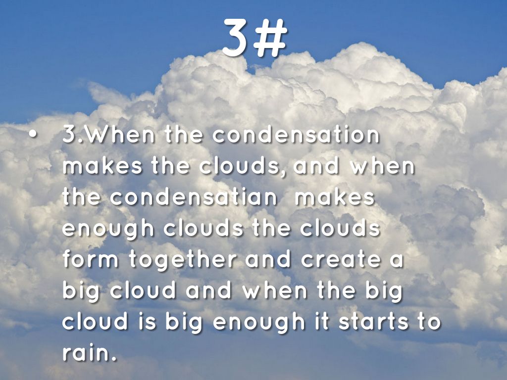 3.When the condensation makes the clouds, and when the condensatian makes enough clouds the clouds form together and create a big cloud and when the big cloud is big enough it starts to rain.