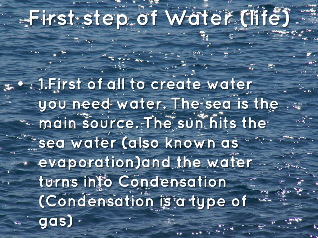 1.First of all to create water you need water. The sea is the main source. The sun hits the sea water (also known as evaporation)and the water turns into Condensation (Condensation is a type of gas)