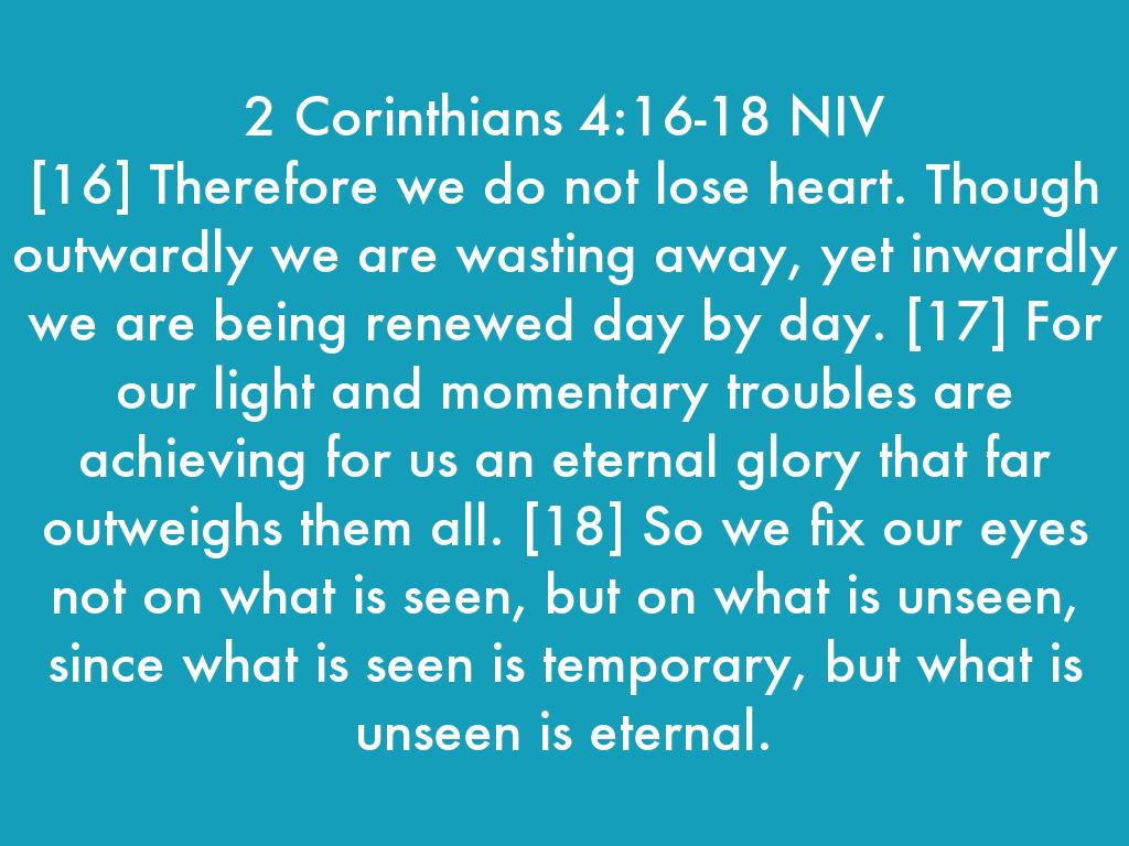 [16] Therefore we do not lose heart. Though outwardly we are wasting away, yet inwardly we are being renewed day by day. [17] For our light and momentary troubles are achieving for us an eternal glory that far outweighs them all. [18] So we fix our eyes not on what is seen, but on what is unseen, since what is seen is temporary, but what is unseen is eternal.