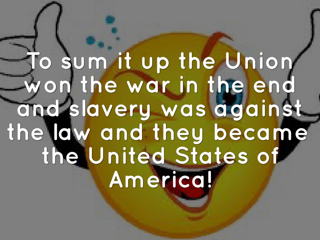 To sum it up the Union won the war in the end and slavery was against the law and they became the United States of America!