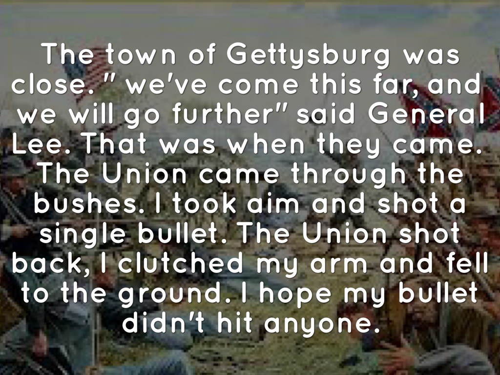 The town of Gettysburg was close. " we've come this far, and we will go further" said General Lee. That was when they came. The Union came through the bushes. I took aim and shot a single bullet. The Union shot back, I clutched my arm and fell to the ground. I hope my bullet didn't hit anyone.