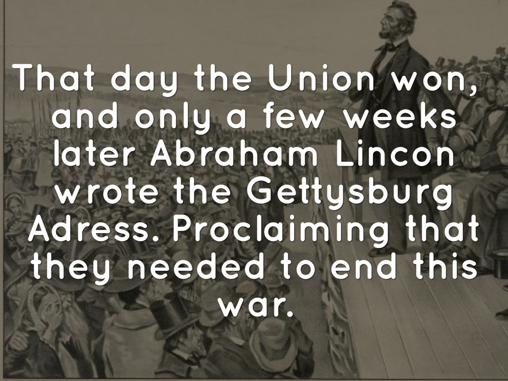 That day the Union won, and only a few weeks later Abraham Lincon wrote the Gettysburg Adress. Proclaiming that they needed to end this war.
