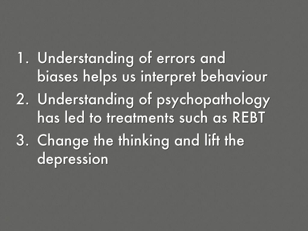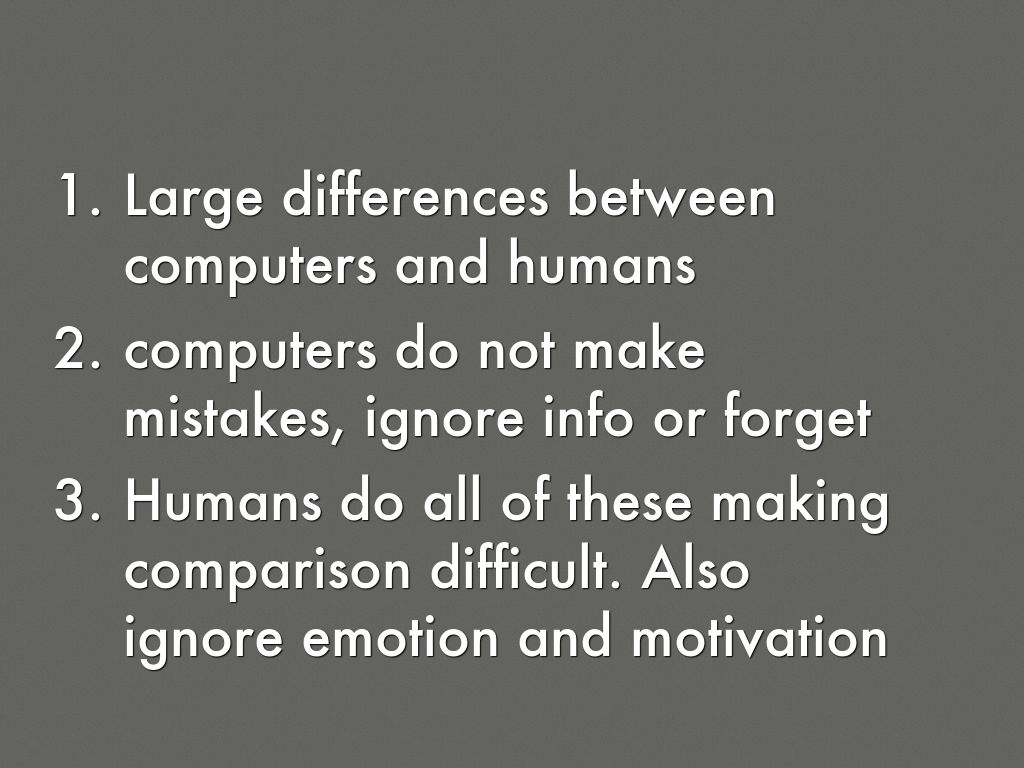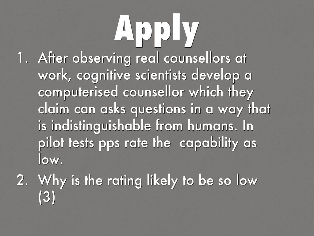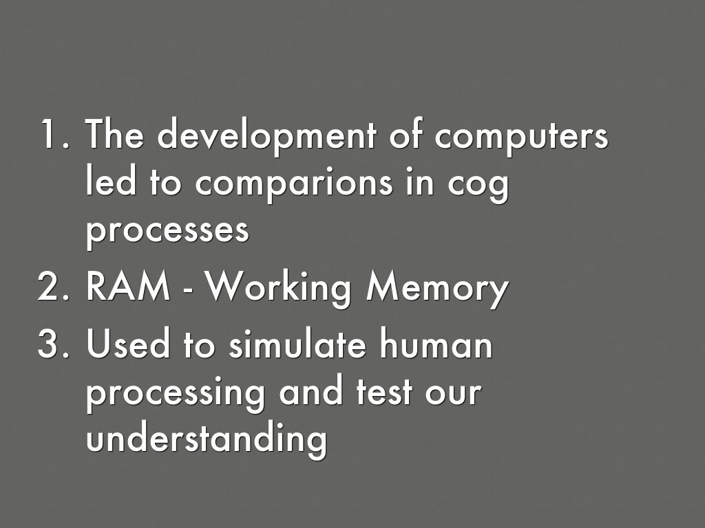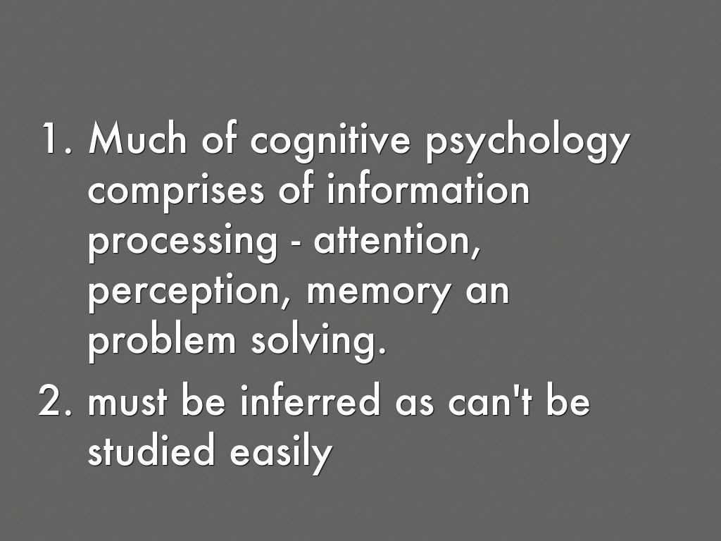 PRESENTATION OUTLINEINTERNAL MENTAL PROCESSES Untitled Slide Much of cognitive psychology comprises of information processing - attention, perception, memory an problem solving. must be inferred as can't be studied easily Untitled Slide Cognitive framework that helps organise and interpret information. Helps us take short cuts but we ignore info that doesn't fit Example Sterotyping THEORETICAL AND COMPUTER MODELS Untitled Slide Such as the WMM are simplified and diagrammatic representations Refined as understanding improves Eg Adding Episodic Buffer Untitled Slide The development of computers led to comparions in cog processes RAM - Working Memory Used to simulate human processing and test our understanding EMERGENCE OF NEUROSCIENCE Untitled Slide Invention of non invasive techniques such as PET scans or fMRI - imporved understanding Eg when we feel guilty we can identify particular brain regions Untitled Slide Understanding of errors and biases helps us interpret behaviour Understanding of psychopathology has led to treatments such as REBT Change the thinking and lift the depression Untitled Slide Favours rigorous scientific methods Conclusions based on more than introspection Much less misleading and much more accurate understanding of behaviour Untitled Slide Large differences between computers and humans computers do not make mistakes, ignore info or forget Humans do all of these making comparison difficult. Also ignore emotion and motivation Untitled Slide Findings often struggle to generalise out of the lab setting Memory tests often use work list and therefore are not valid Experiments often lack the realism to represent normal human behaviour Apply After observing real counsellors at work, cognitive scientists develop a computerised counsellor which they claim can asks questions in a way that is indistinguishable from humans. In pilot tests pps rate the capability as low. Why is the rating likely to be so low (3) Haiku Deck Pro User
