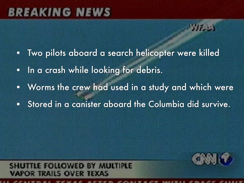 • February 1, 2003, the space shuttle Columbia broke Apart while re-entering