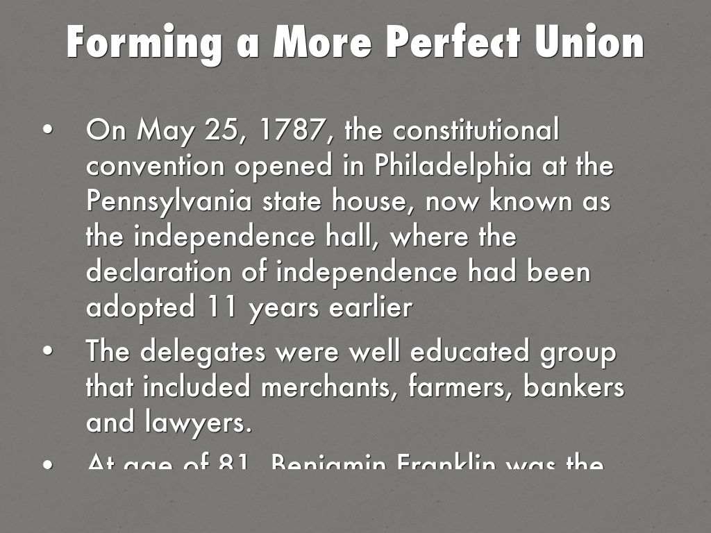 On May 25, 1787, the constitutional convention opened in Philadelphia at the Pennsylvania state house, now known as the independence hall, where the declaration of independence had been adopted 11 years earlier