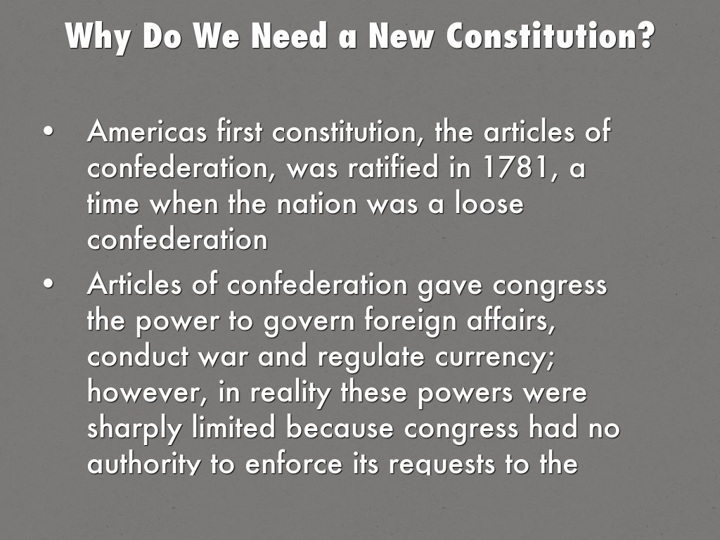 Americas first constitution, the articles of confederation, was ratified in 1781, a time when the nation was a loose confederation
