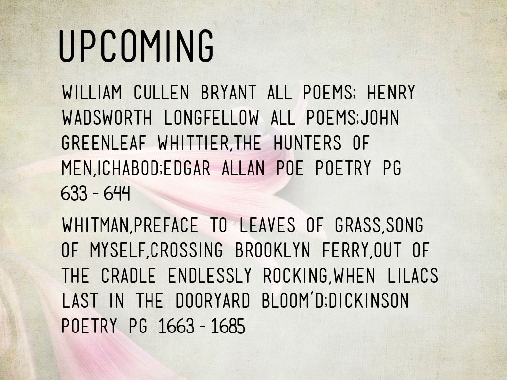 - William Cullen Bryant all poems; Henry Wadsworth Longfellow all poems;John Greenleaf Whittier,The Hunters of Men,Ichabod;Edgar Allan Poe poetry pg 633-644