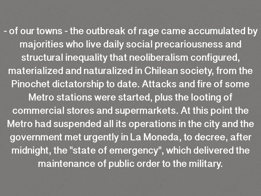 - of our towns - the outbreak of rage came accumulated by majorities who live daily social precariousness and structural inequality that neoliberalism configured, materialized and naturalized in Chilean society, from the Pinochet dictatorship to date. Attacks and fire of some Metro stations were started, plus the looting of commercial stores and supermarkets. At this point the Metro had suspended all its operations in the city and the government met urgently in La Moneda, to decree, after midnight, the "state of emergency", which delivered the maintenance of public order to the military.