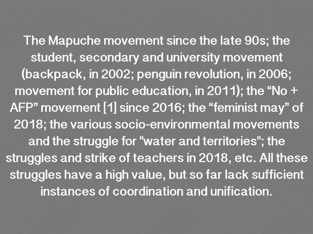 The Mapuche movement since the late 90s; the student, secondary and university movement (backpack, in 2002; penguin revolution, in 2006; movement for public education, in 2011); the “No + AFP” movement [1] since 2016; the “feminist may” of 2018; the various socio-environmental movements and the struggle for "water and territories"; the struggles and strike of teachers in 2018, etc. All these struggles have a high value, but so far lack sufficient instances of coordination and unification.