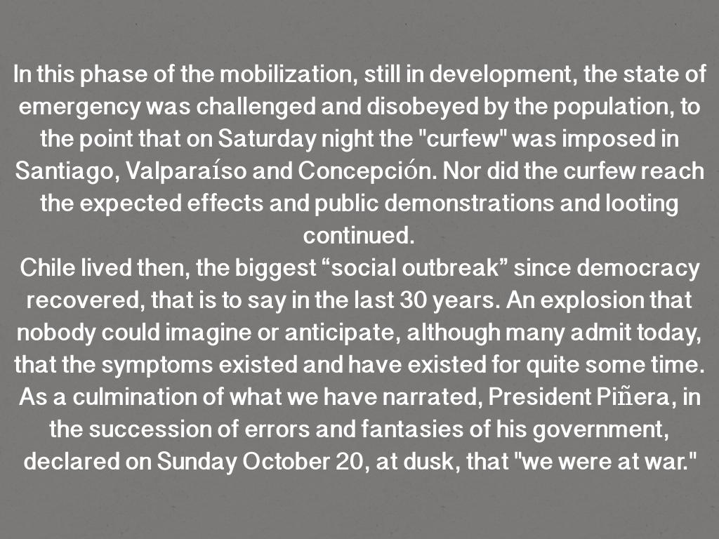 In this phase of the mobilization, still in development, the state of emergency was challenged and disobeyed by the population, to the point that on Saturday night the "curfew" was imposed in Santiago, Valparaíso and Concepción. Nor did the curfew reach the expected effects and public demonstrations and looting continued.