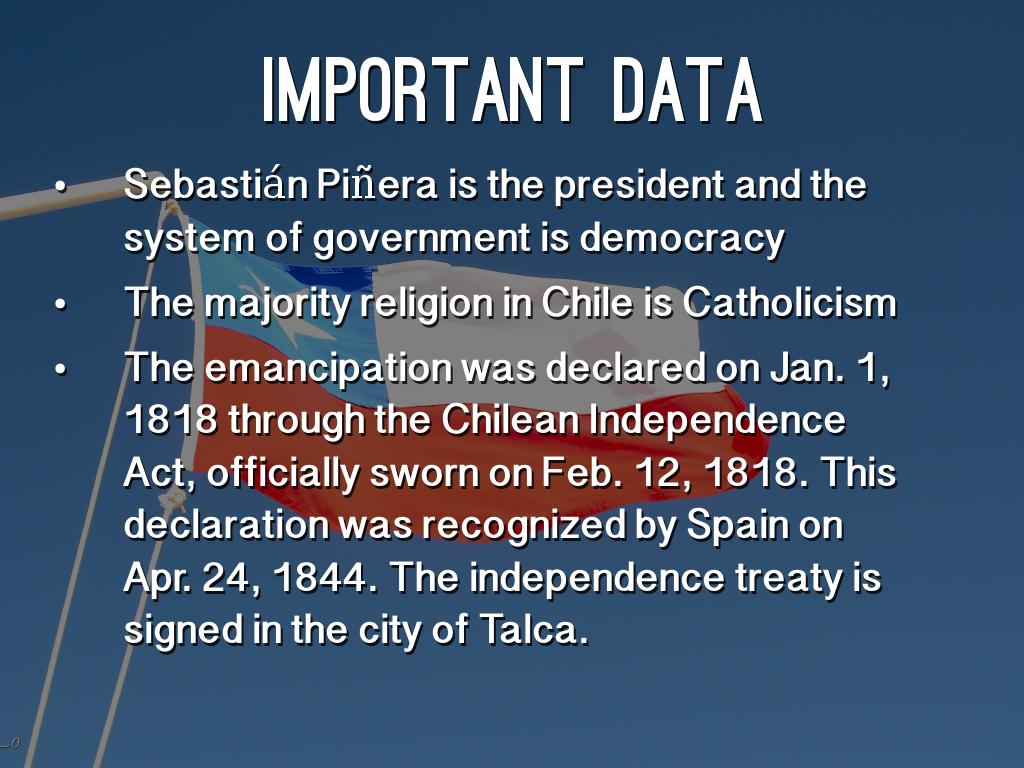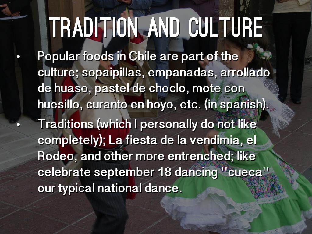 - Traditions (which I personally do not like completely); La fiesta de la vendimia, el Rodeo, and other more entrenched; like celebrate september 18 dancing ''cueca'' our typical national dance.