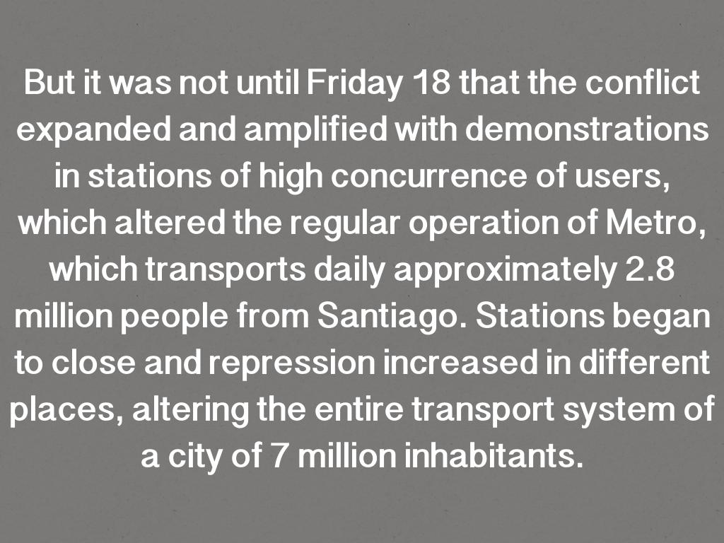 But it was not until Friday 18 that the conflict expanded and amplified with demonstrations in stations of high concurrence of users, which altered the regular operation of Metro, which transports daily approximately 2.8 million people from Santiago. Stations began to close and repression increased in different places, altering the entire transport system of a city of 7 million inhabitants.