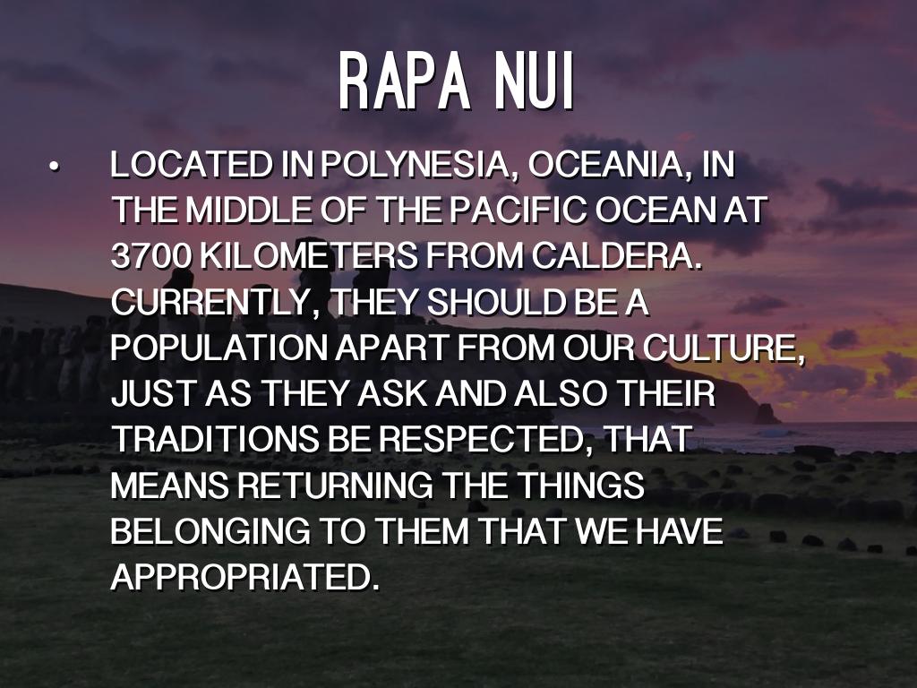 - LOCATED IN POLYNESIA, OCEANIA, IN THE MIDDLE OF THE PACIFIC OCEAN AT 3700 KILOMETERS FROM CALDERA. CURRENTLY, THEY SHOULD BE A POPULATION APART FROM OUR CULTURE, JUST AS THEY ASK AND ALSO THEIR TRADITIONS BE RESPECTED, THAT MEANS RETURNING THE THINGS BELONGING TO THEM THAT WE HAVE APPROPRIATED.