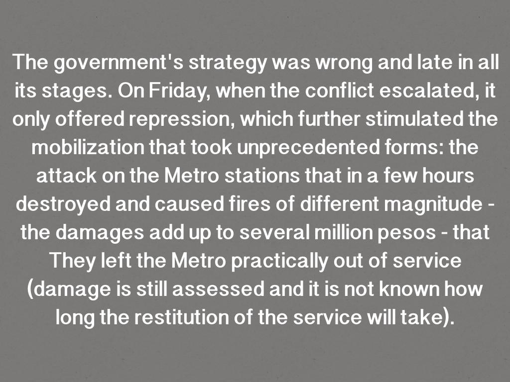 The government's strategy was wrong and late in all its stages. On Friday, when the conflict escalated, it only offered repression, which further stimulated the mobilization that took unprecedented forms: the attack on the Metro stations that in a few hours destroyed and caused fires of different magnitude - the damages add up to several million pesos - that They left the Metro practically out of service (damage is still assessed and it is not known how long the restitution of the service will take).
