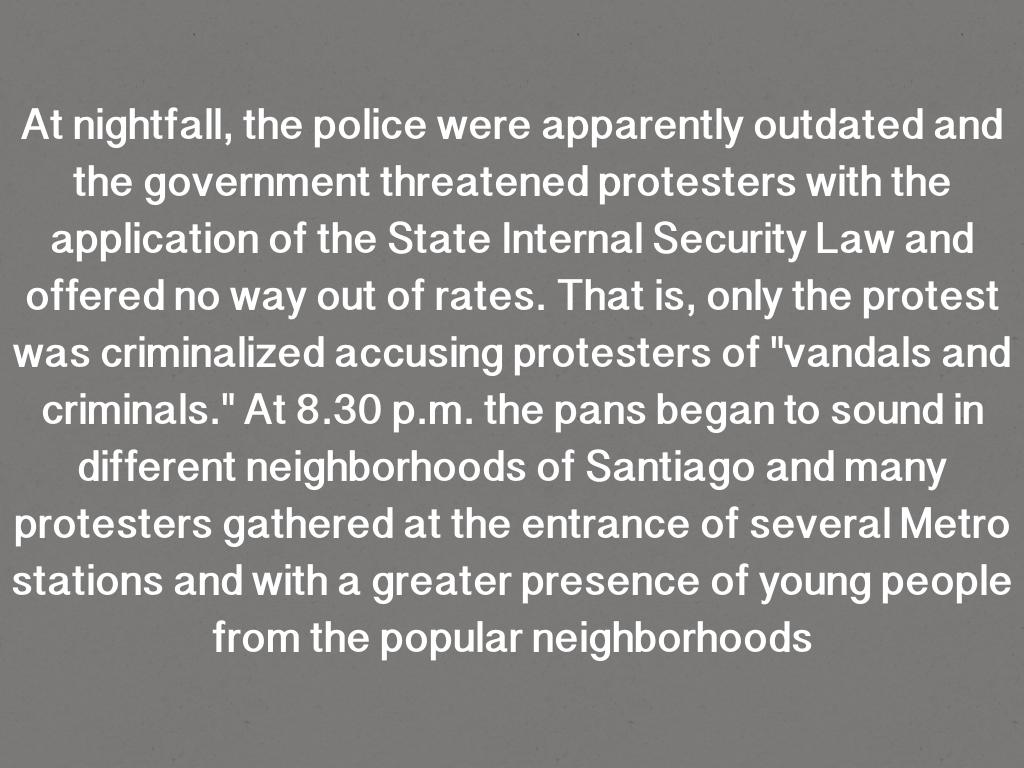 At nightfall, the police were apparently outdated and the government threatened protesters with the application of the State Internal Security Law and offered no way out of rates. That is, only the protest was criminalized accusing protesters of "vandals and criminals." At 8.30 p.m. the pans began to sound in different neighborhoods of Santiago and many protesters gathered at the entrance of several Metro stations and with a greater presence of young people from the popular neighborhoods