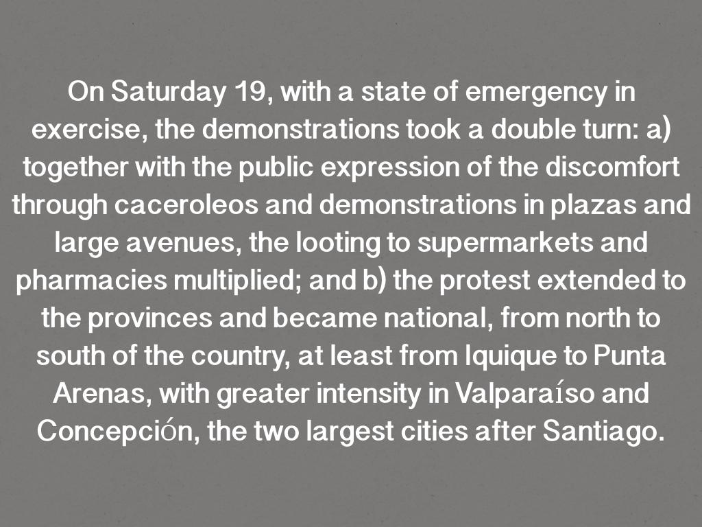 On Saturday 19, with a state of emergency in exercise, the demonstrations took a double turn: a) together with the public expression of the discomfort through caceroleos and demonstrations in plazas and large avenues, the looting to supermarkets and pharmacies multiplied; and b) the protest extended to the provinces and became national, from north to south of the country, at least from Iquique to Punta Arenas, with greater intensity in Valparaíso and Concepción, the two largest cities after Santiago.