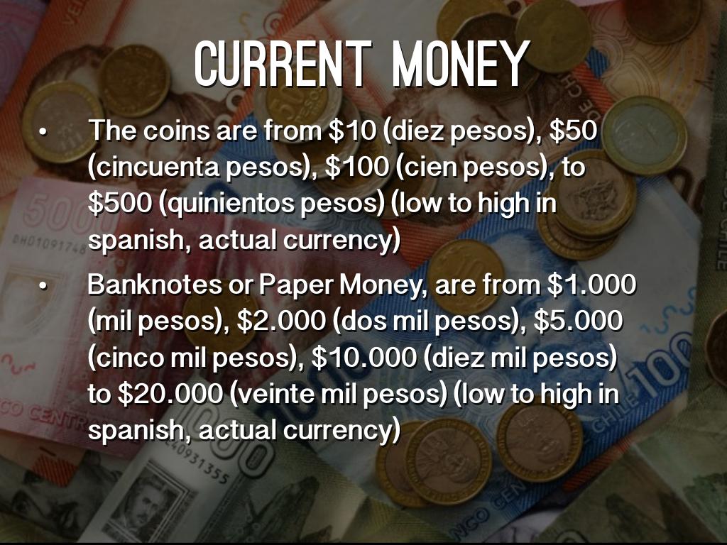 - Banknotes or Paper Money, are from $1.000 (mil pesos), $2.000 (dos mil pesos), $5.000 (cinco mil pesos), $10.000 (diez mil pesos) to $20.000 (veinte mil pesos) (low to high in spanish, actual currency)