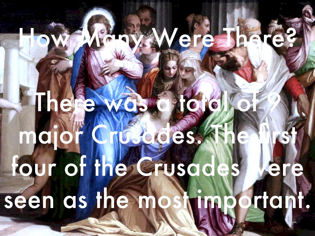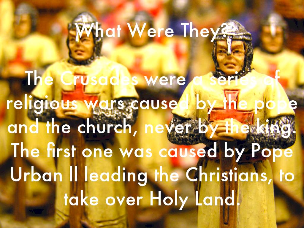 The Crusades were a series of religious wars caused by the pope and the church, never by the king. The first one was caused by Pope Urban ll leading the Christians, to take over Holy Land.