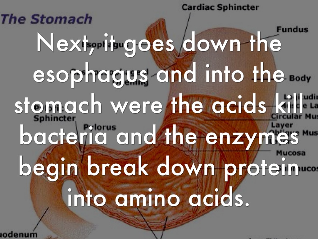 Next, it goes down the esophagus and into the stomach were the acids kill bacteria and the enzymes begin break down protein into amino acids.