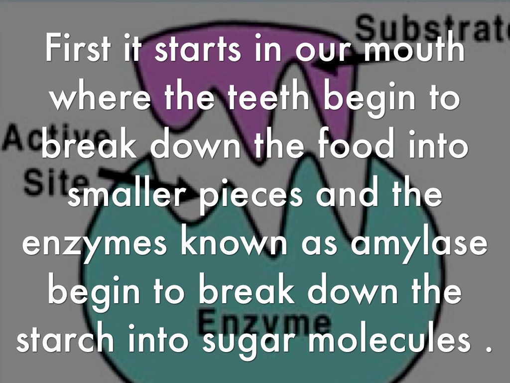 First it starts in our mouth where the teeth begin to break down the food into smaller pieces and the enzymes known as amylase begin to break down the starch into sugar molecules .