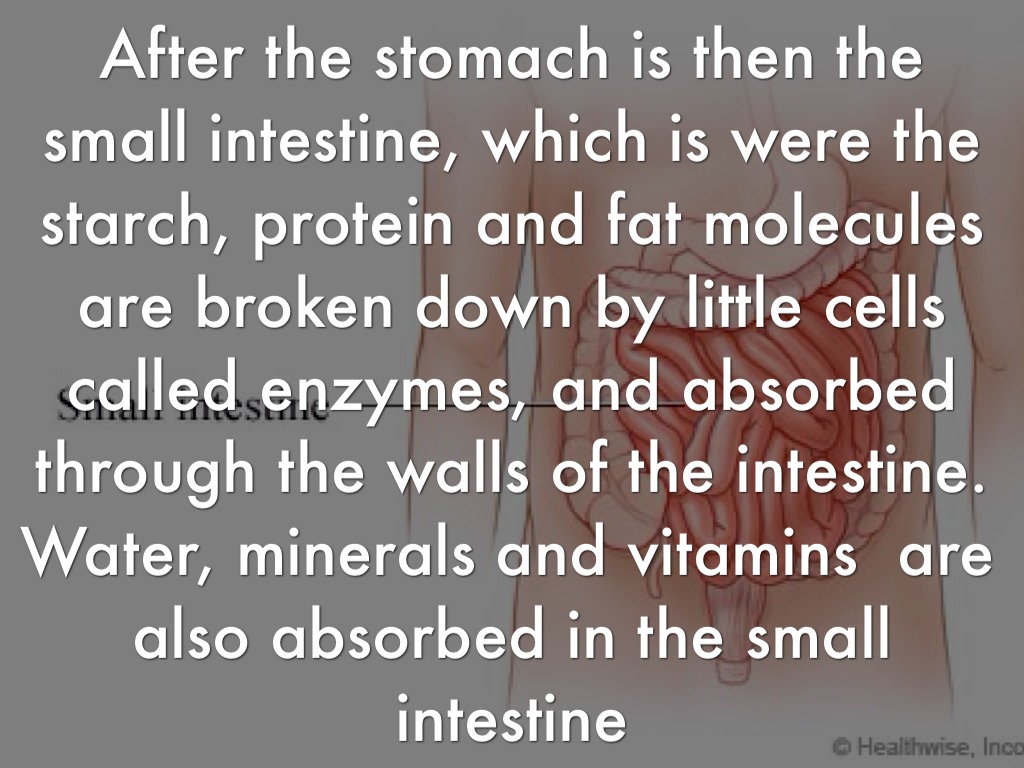 After the stomach is then the small intestine, which is were the starch, protein and fat molecules are broken down by little cells called enzymes, and absorbed through the walls of the intestine. Water, minerals and vitamins are also absorbed in the small intestine