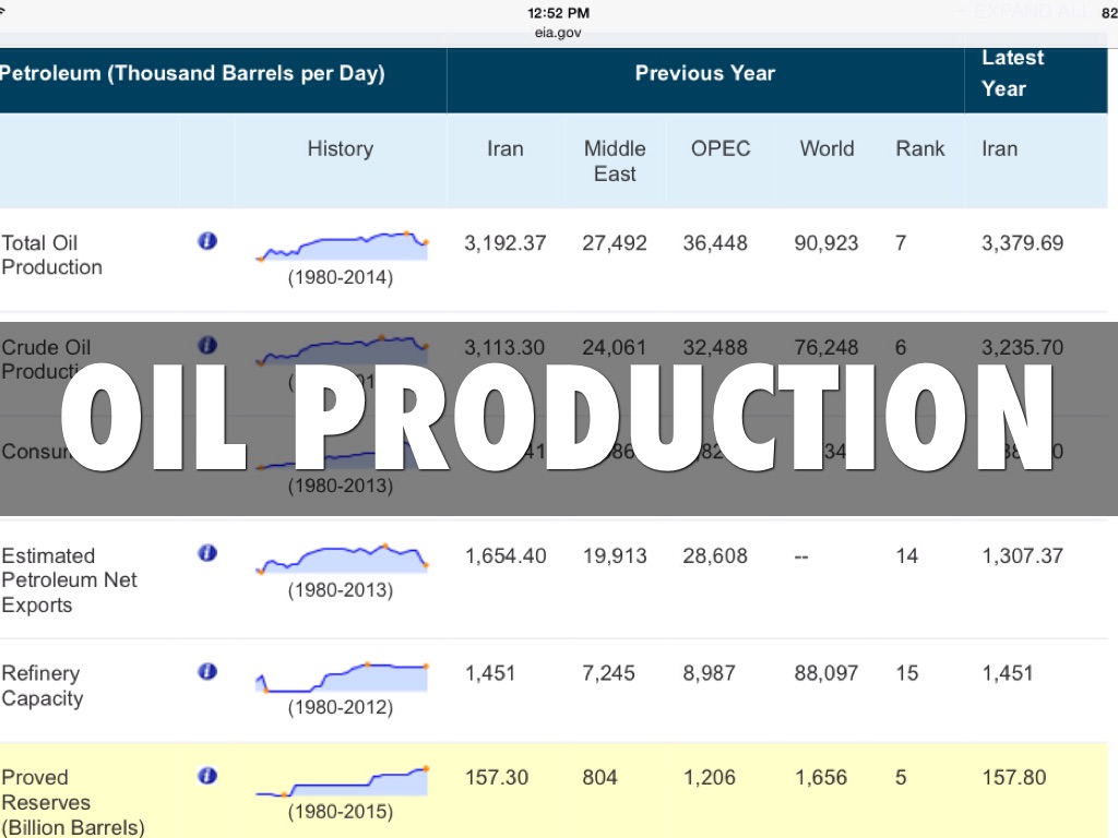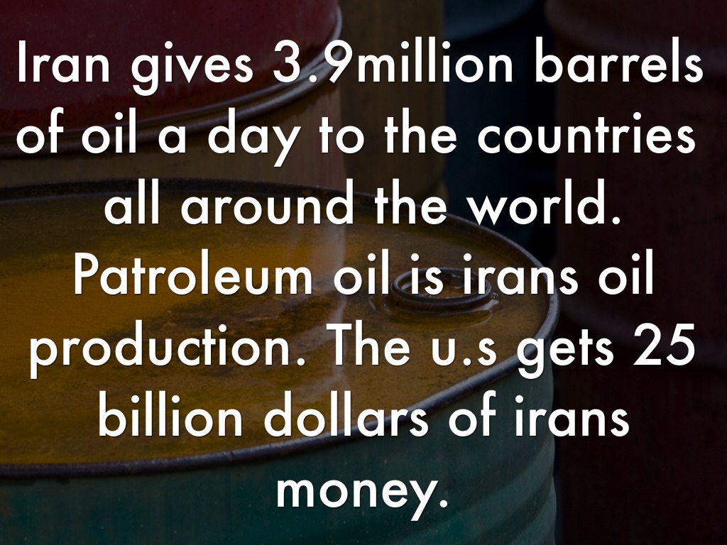 Iran gives 3.9million barrels of oil a day to the countries all around the world. Patroleum oil is irans oil production. The u.s gets 25 billion dollars of irans money.