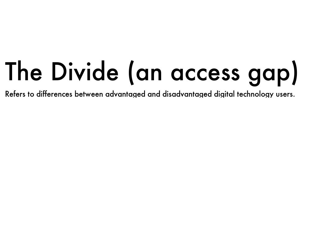• “The digital divide or digital inequality originally described the gap between advantaged and disadvantaged computer users and nonusers in the United States and often focused on socioeconomic differences primarily regarding use of the Internet (A. van Deursen, J. van Dijk, 2013).