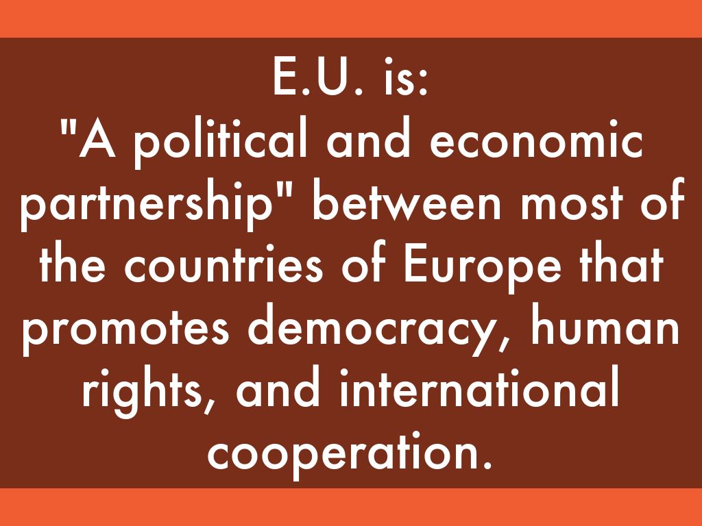 "A political and economic partnership" between most of the countries of Europe that promotes democracy, human rights, and international cooperation.