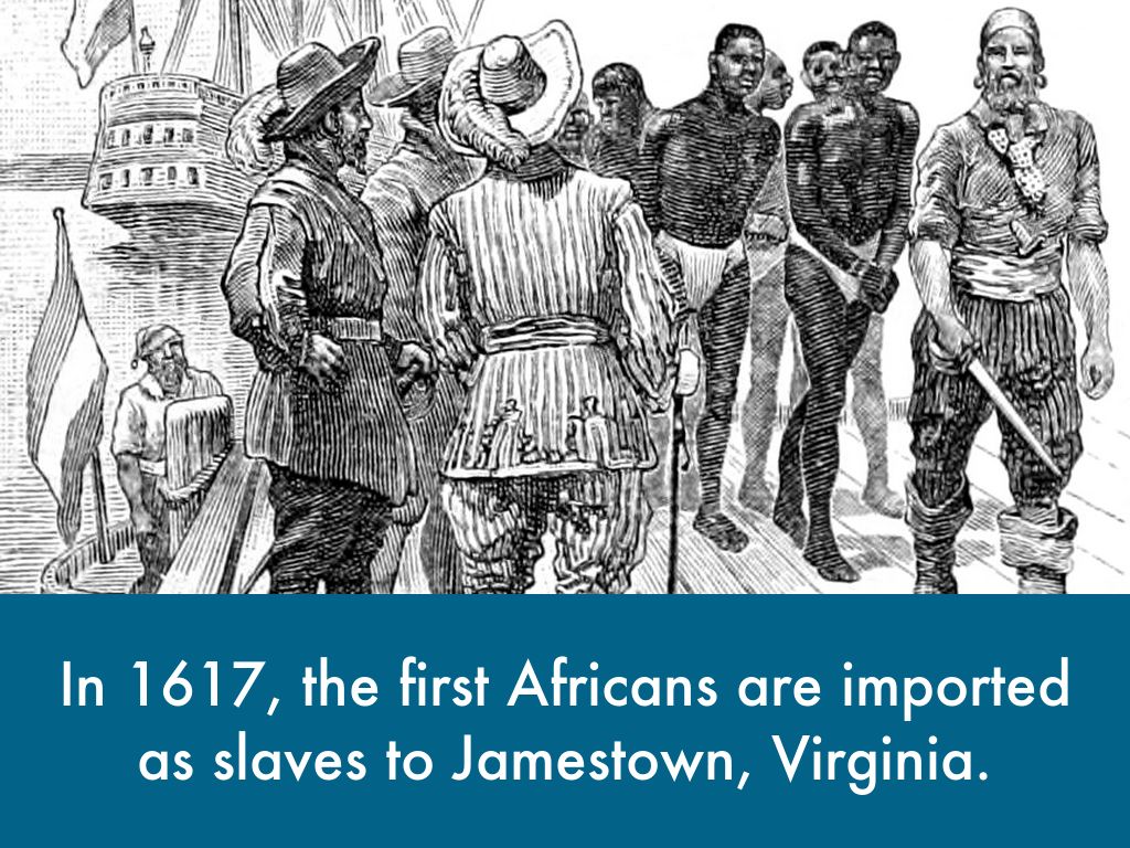 In 1617, the first Africans are imported as slaves to Jamestown, Virginia.