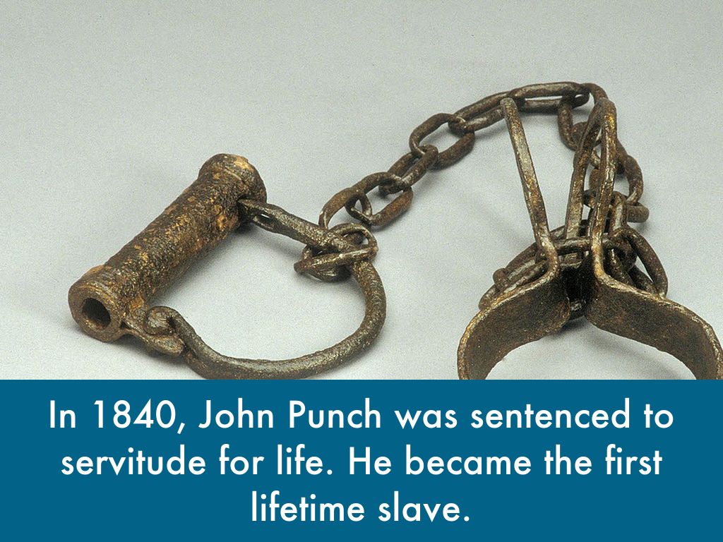 In 1840, John Punch was sentenced to servitude for life. He became the first lifetime slave.