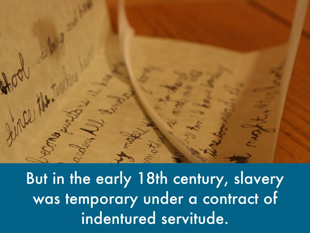 But in the early 18th century, slavery was temporary under a contract of indentured servitude.