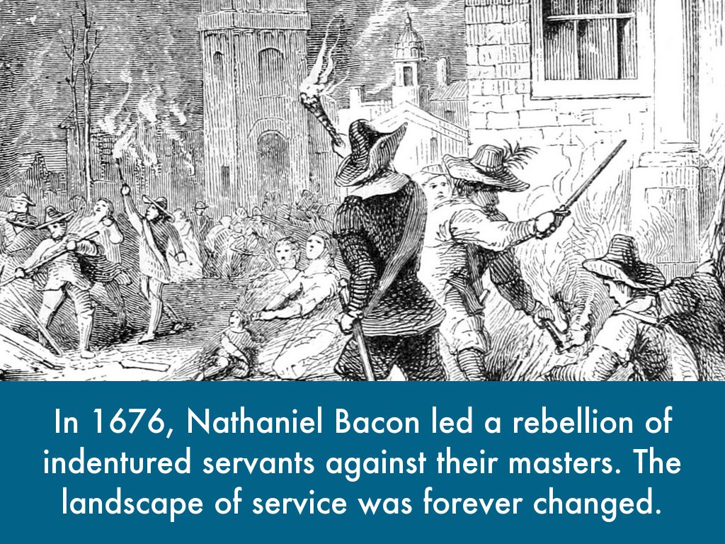 In 1676, Nathaniel Bacon led a rebellion of indentured servants against their masters. The landscape of service was forever changed.