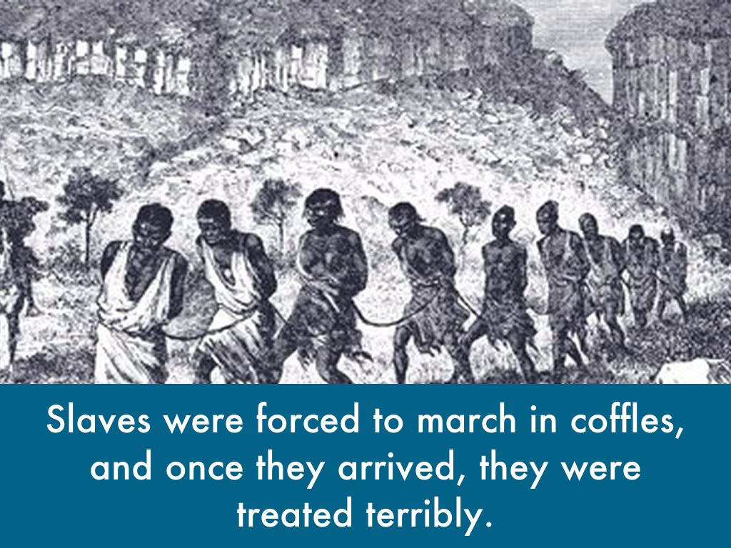 Slaves were forced to march in coffles, and once they arrived, they were treated terribly.