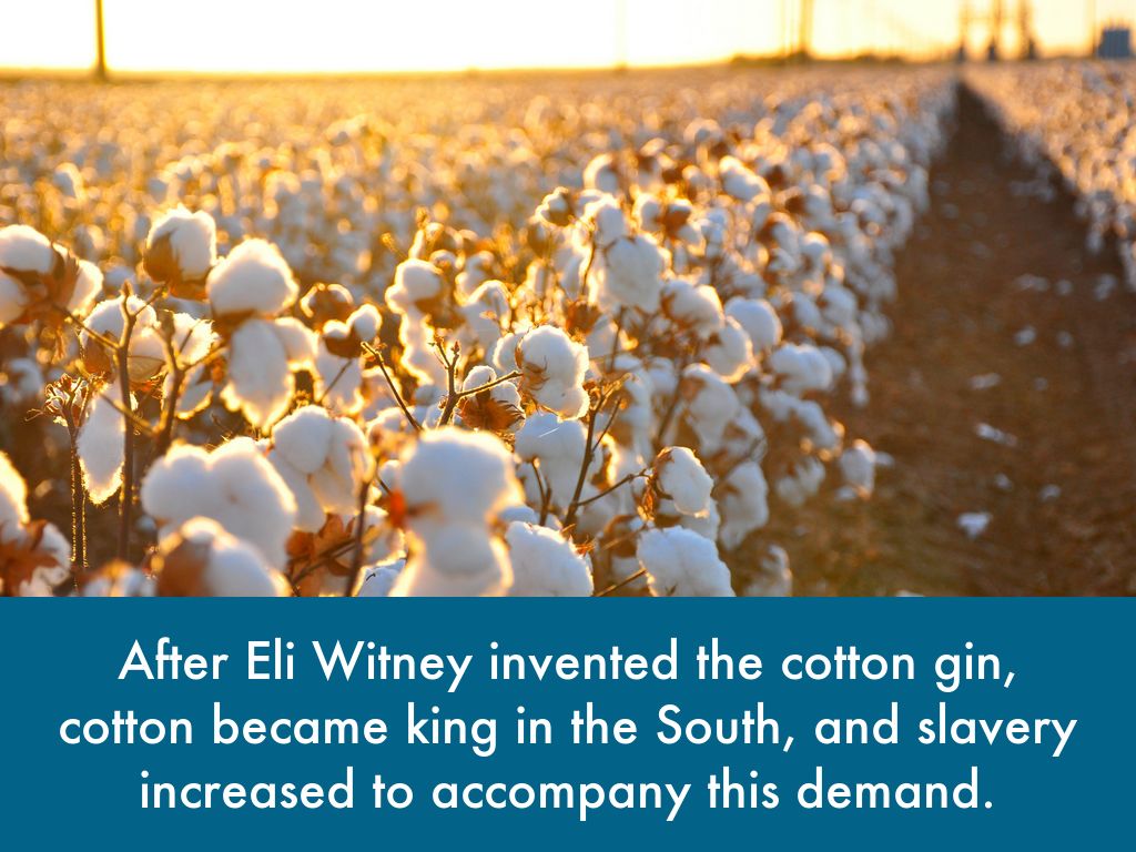 After Eli Witney invented the cotton gin, cotton became king in the South, and slavery increased to accompany this demand.