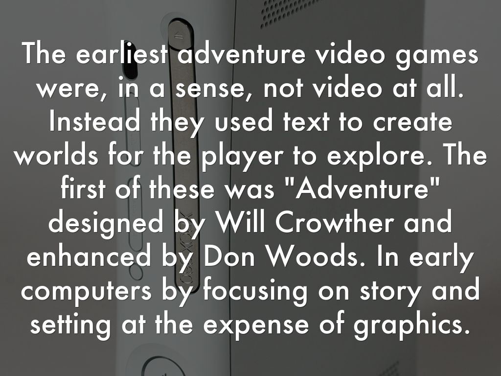 The earliest adventure video games were, in a sense, not video at all. Instead they used text to create worlds for the player to explore. The first of these was "Adventure" designed by Will Crowther and enhanced by Don Woods. In early computers by focusing on story and setting at the expense of graphics.