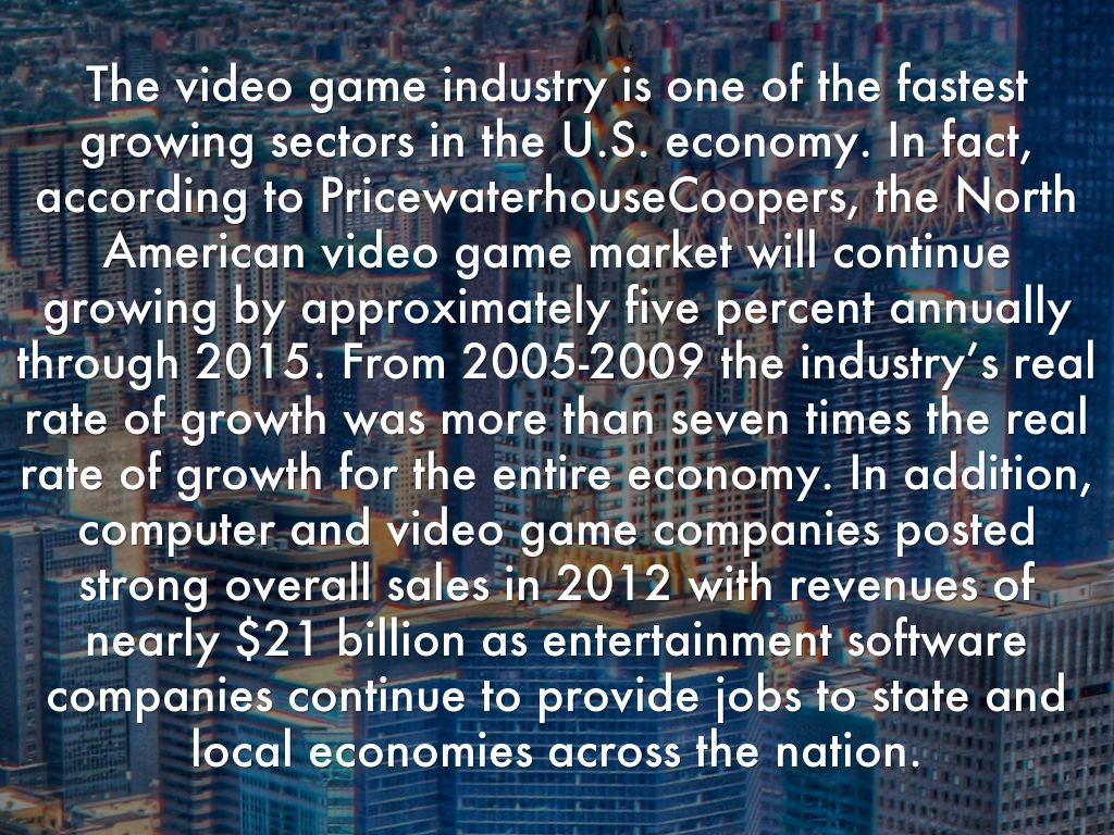 The video game industry is one of the fastest growing sectors in the U.S. economy. In fact, according to PricewaterhouseCoopers, the North American video game market will continue growing by approximately five percent annually through 2015. From 2005-2009 the industry’s real rate of growth was more than seven times the real rate of growth for the entire economy. In addition, computer and video game companies posted strong overall sales in 2012 with revenues of nearly $21 billion as entertainment software companies continue to provide jobs to state and local economies across the nation.