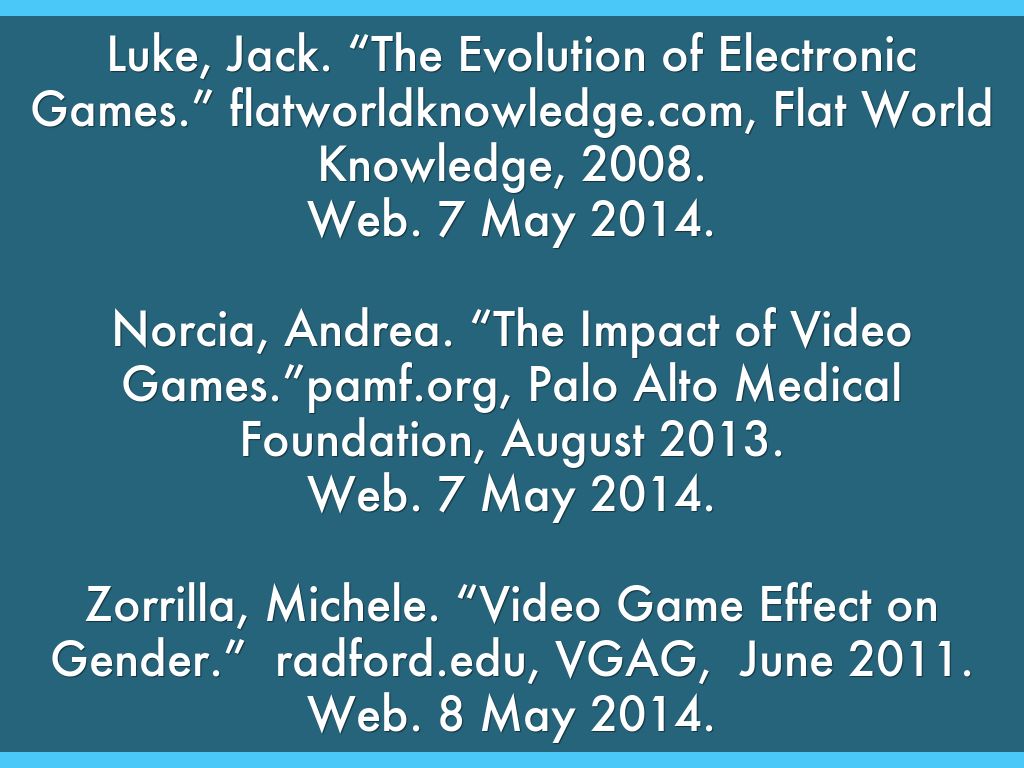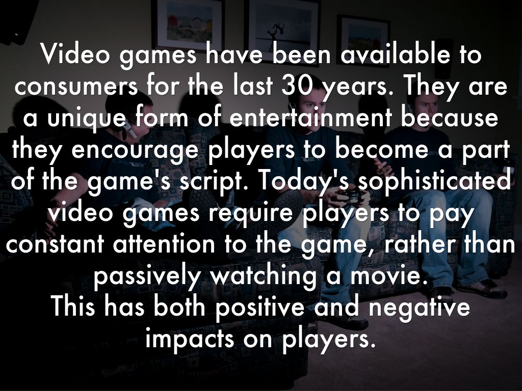 Video games have been available to consumers for the last 30 years. They are a unique form of entertainment because they encourage players to become a part of the game's script. Today's sophisticated video games require players to pay constant attention to the game, rather than passively watching a movie. This has both positive and negative impacts on players.