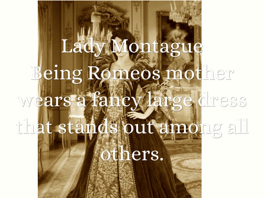 Being Romeos mother wears a fancy large dress that stands out among all others.