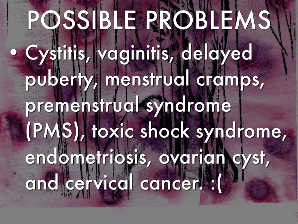 Cystitis, vaginitis, delayed puberty, menstrual cramps, premenstrual syndrome (PMS), toxic shock syndrome, endometriosis, ovarian cyst, and cervical cancer. :(