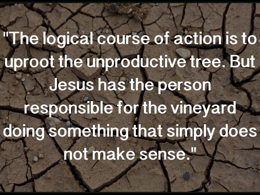 "The logical course of action is to uproot the unproductive tree. But Jesus has the person responsible for the vineyard doing something that simply does not make sense."