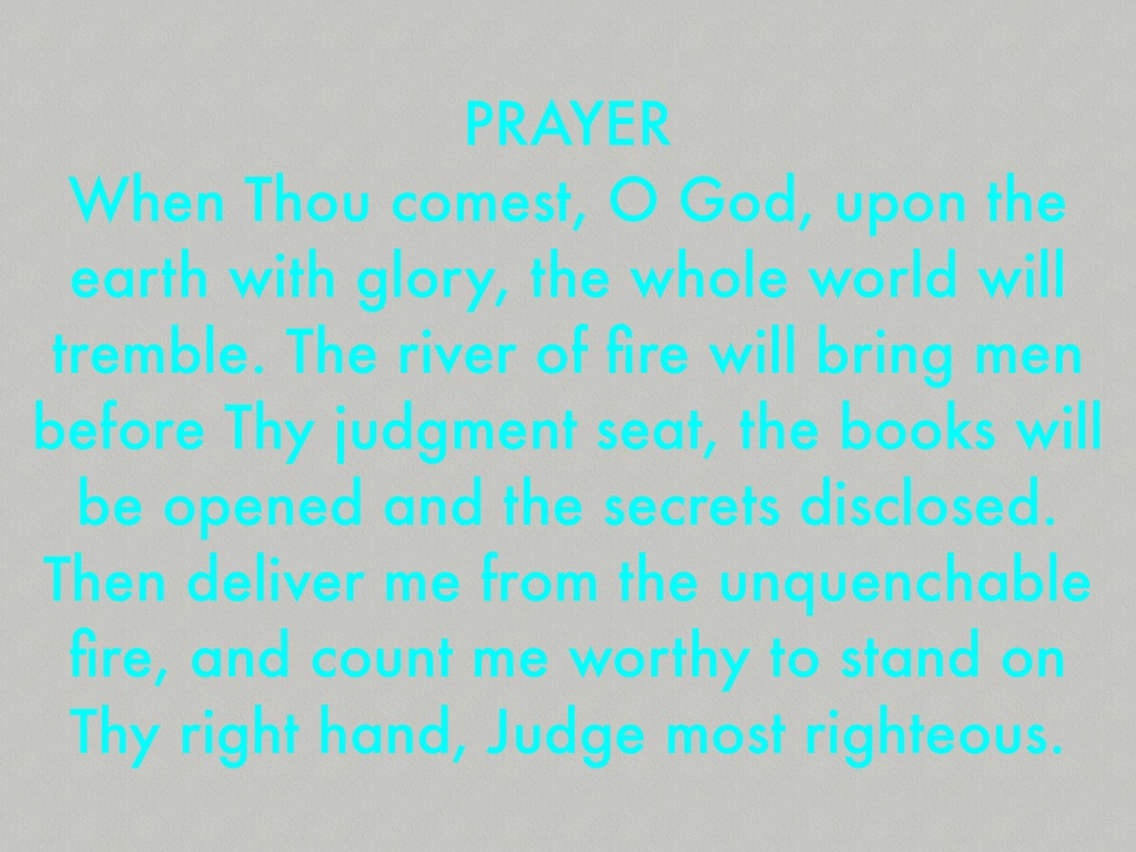 When Thou comest, O God, upon the earth with glory, the whole world will tremble. The river of fire will bring men before Thy judgment seat, the books will be opened and the secrets disclosed. Then deliver me from the unquenchable fire, and count me worthy to stand on Thy right hand, Judge most righteous.